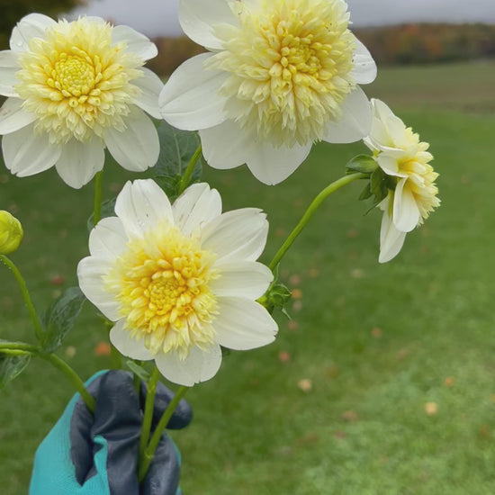 Such a pretty anemone style dahlia! The cheerful butter cup and cream colors add interest and whimsy into floral arrangements. Long stems and productive plants!